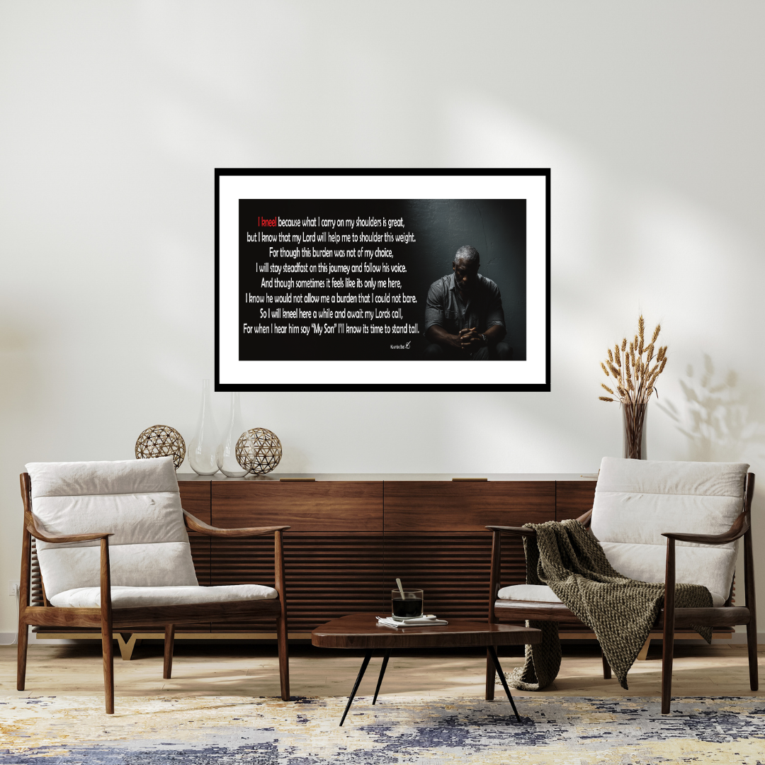 A striking and emotional declaration of faith, I Kneel is a Christian poem print that reflects strength, surrender, and reliance on God’s guidance. Paired with a powerful image of a man in prayer, this artwork captures the essence of humility and steadfastness in the face of life’s burdens.