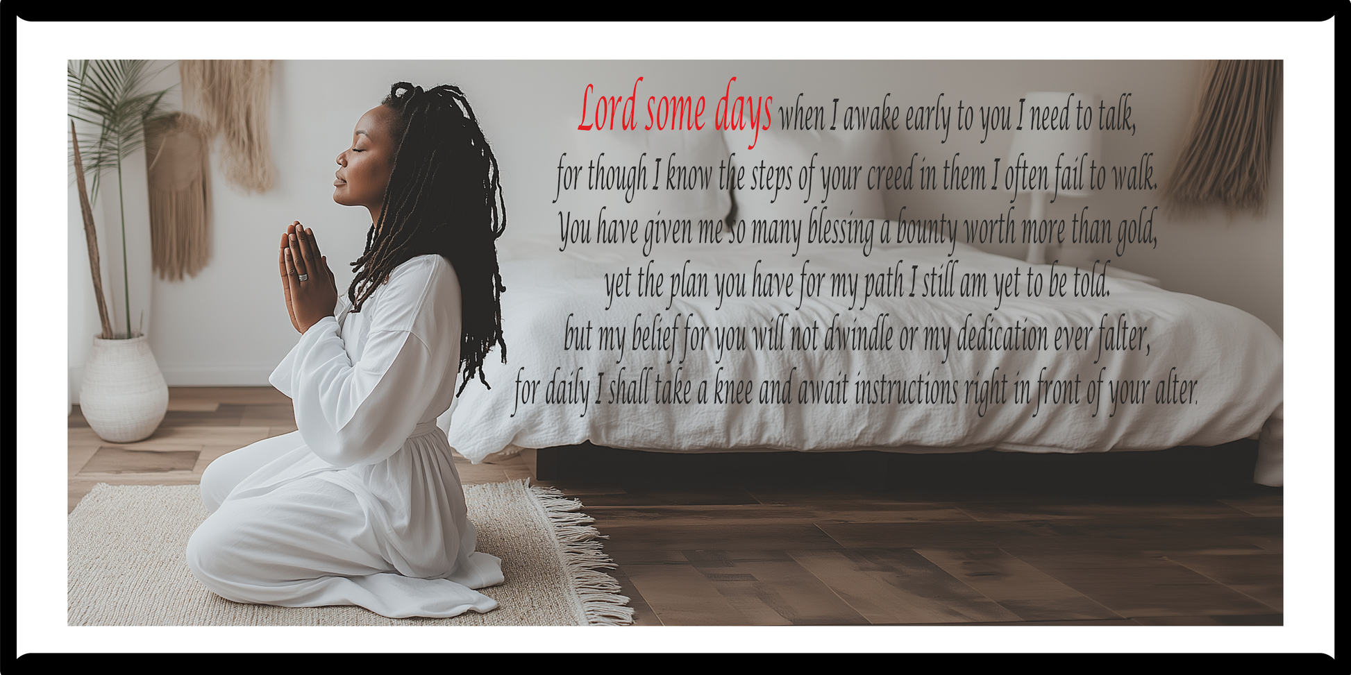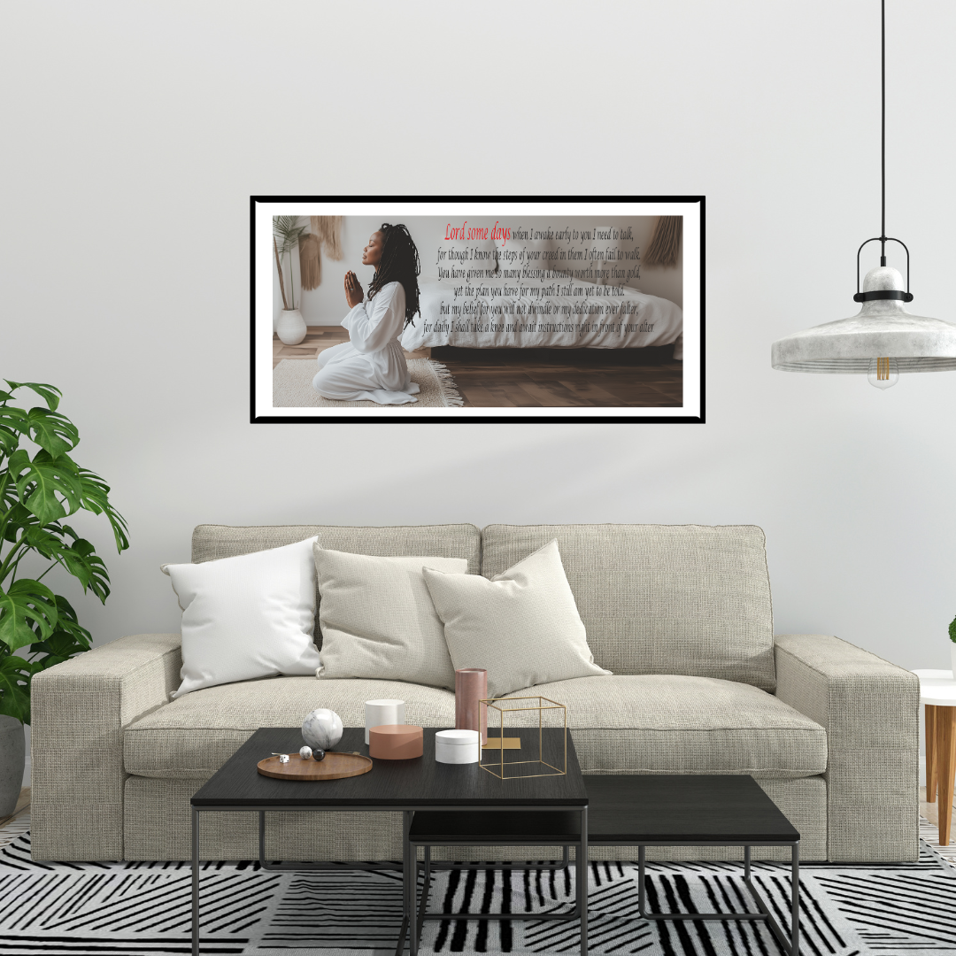 Bring peace, reflection, and devotion into your home with this inspiring Christian wall art. Lord Some Days is a heartfelt prayer poem paired with the serene image of a woman in white kneeling in prayer. This artwork beautifully expresses the struggle of faith, the need for guidance, and the daily renewal of trust in God’s plan.