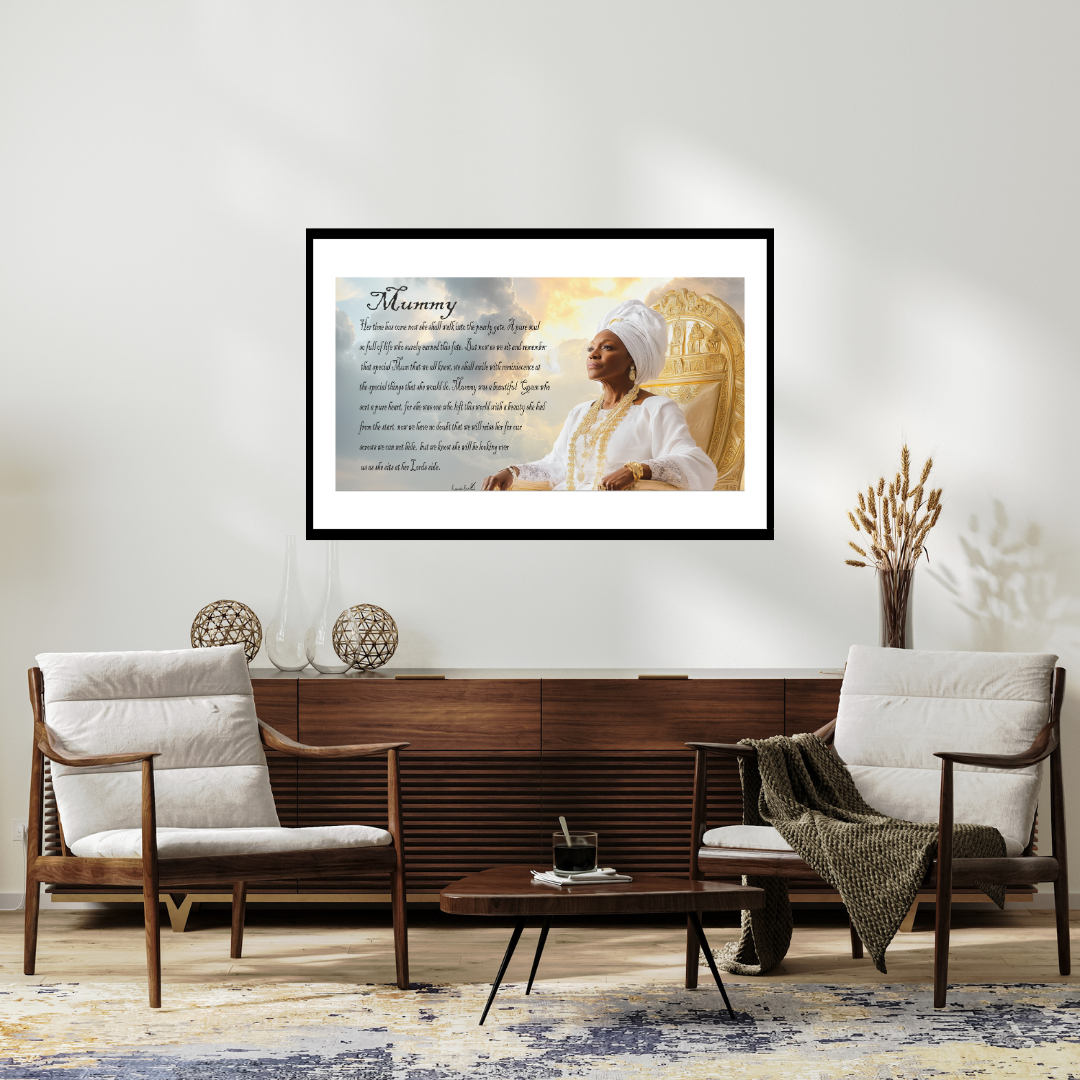 Honor the memory of a beloved mother with this powerful and elegant wall art. Mummy is a heartfelt poem paired with a regal portrait of a graceful woman seated on a golden throne, dressed in white, symbolizing purity, strength, and eternal peace.