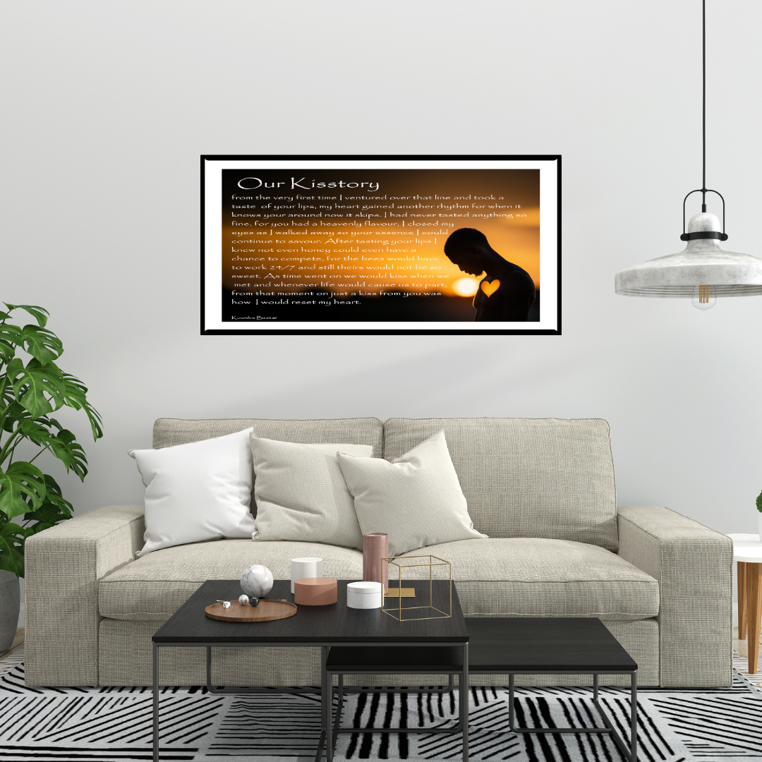 Celebrate love, passion, and intimacy with Our Kisstory, a beautifully written romantic poem paired with the striking image of a man silhouetted against a glowing sunset, a heart illuminated on his chest. This artwork captures the sweetness of a first kiss, the depth of connection it creates, and the way love transforms the rhythm of the heart.