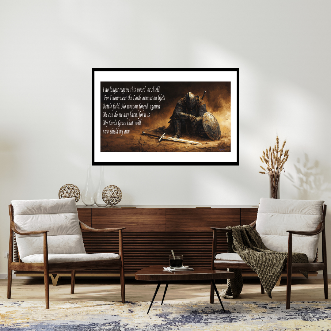 A bold declaration of faith and strength, The Lord’s Armour is an inspiring Christian poem paired with the powerful image of a knight kneeling on the battlefield. The poem reminds us that we no longer fight life’s battles with earthly weapons, but with the grace and protection of God’s armour.