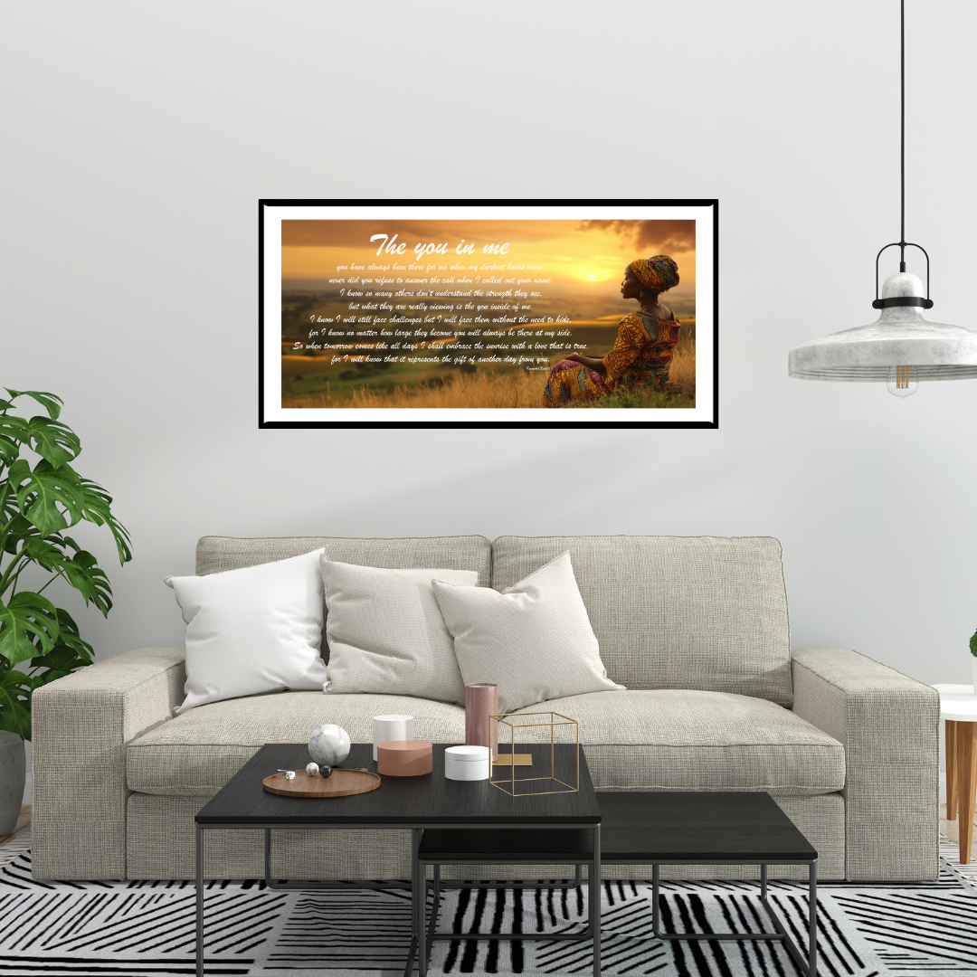 Celebrate love, strength, and gratitude with this deeply moving wall art. The You in Me is a heartfelt poem paired with a powerful image of a woman in traditional African attire, sitting peacefully at sunset. This print embodies inner strength, resilience, and the profound impact of those we love who accompany us through life’s challenges.
