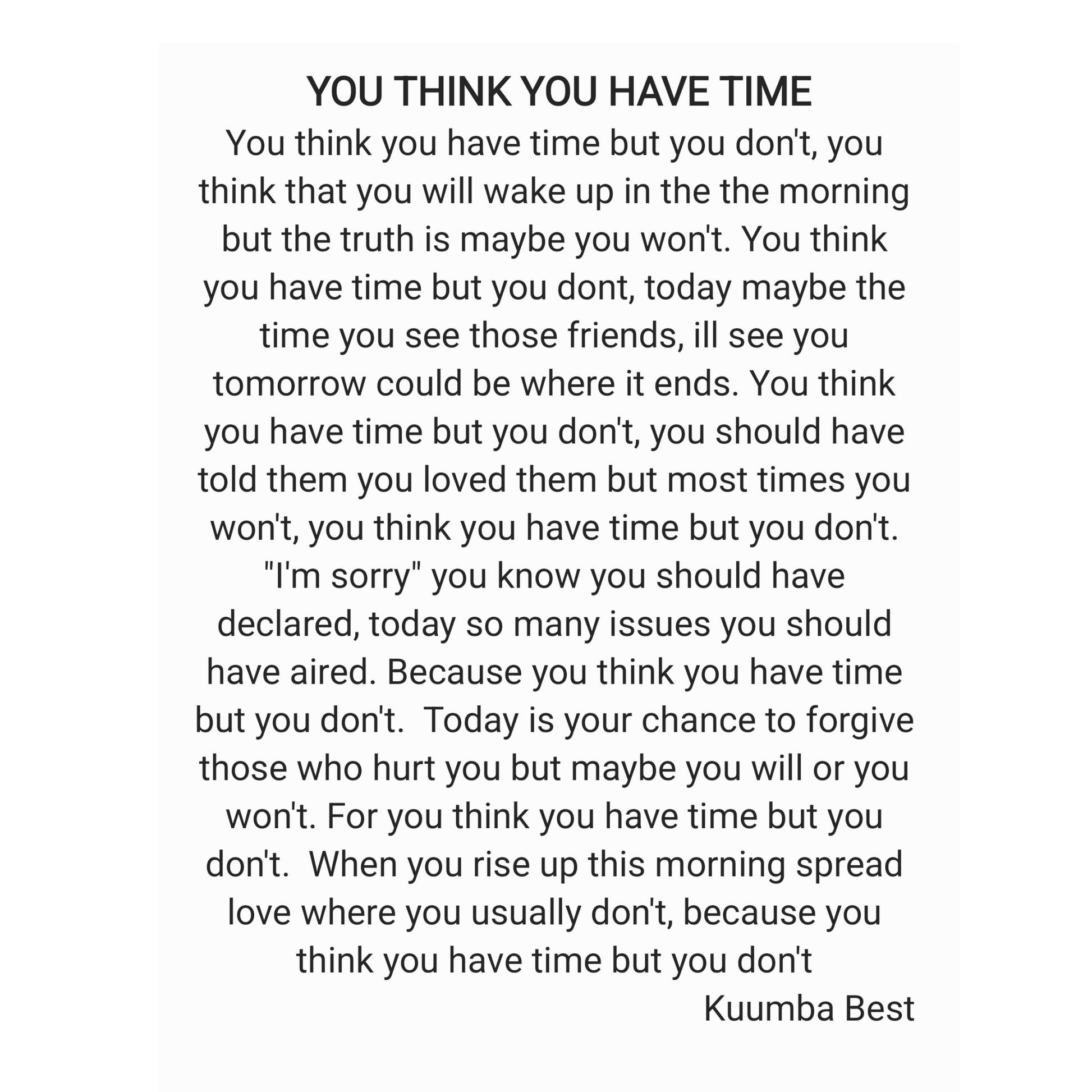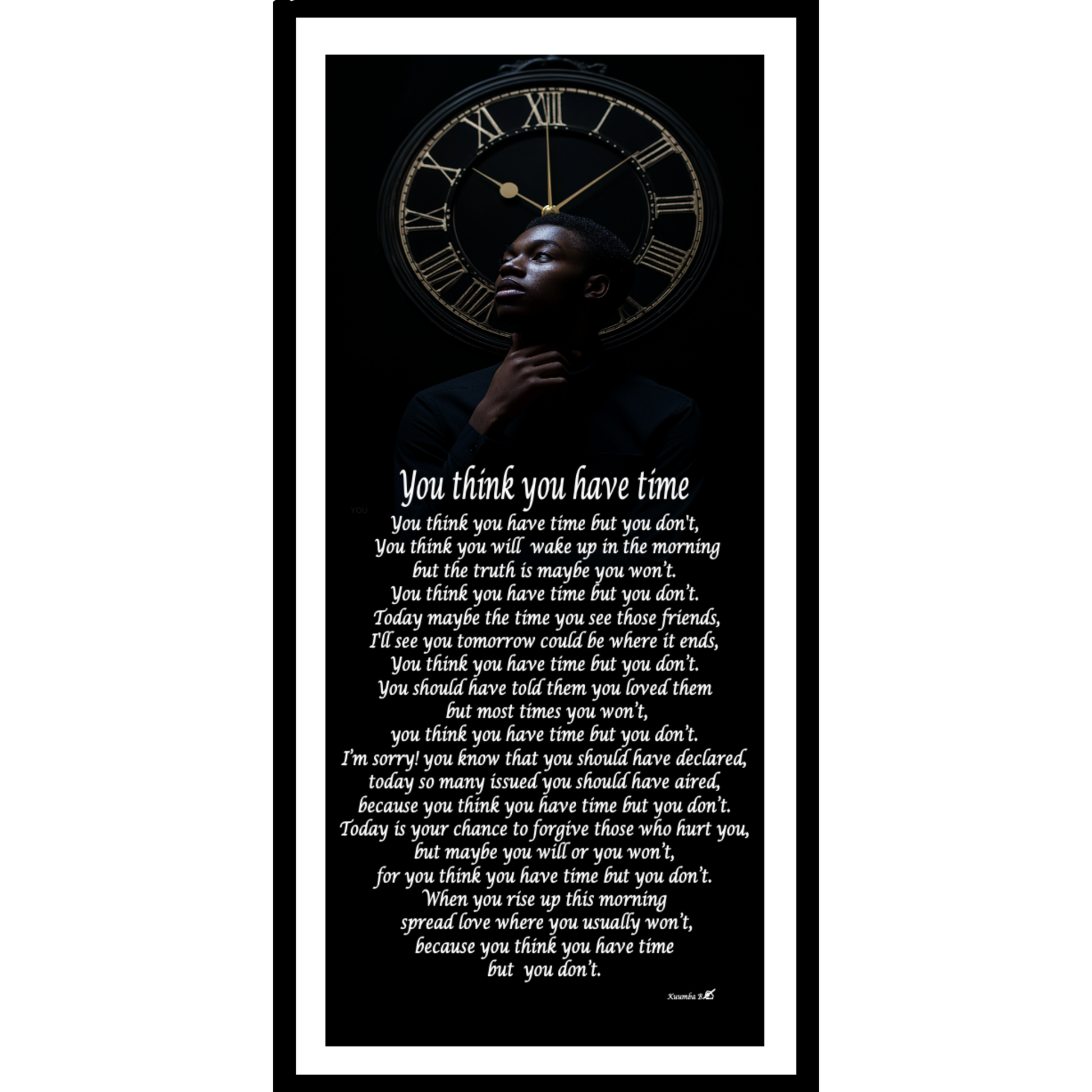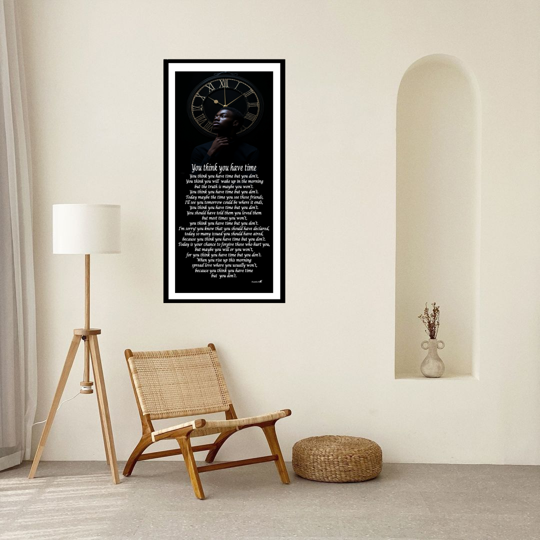 Confront the fragility of life and the urgency of love with You Think You Have Time, a powerful poem print paired with the image of a young man beneath a giant clock. This artwork is a visual and poetic reminder that tomorrow is not promised and that we must live fully, love openly, and forgive freely while we still can.